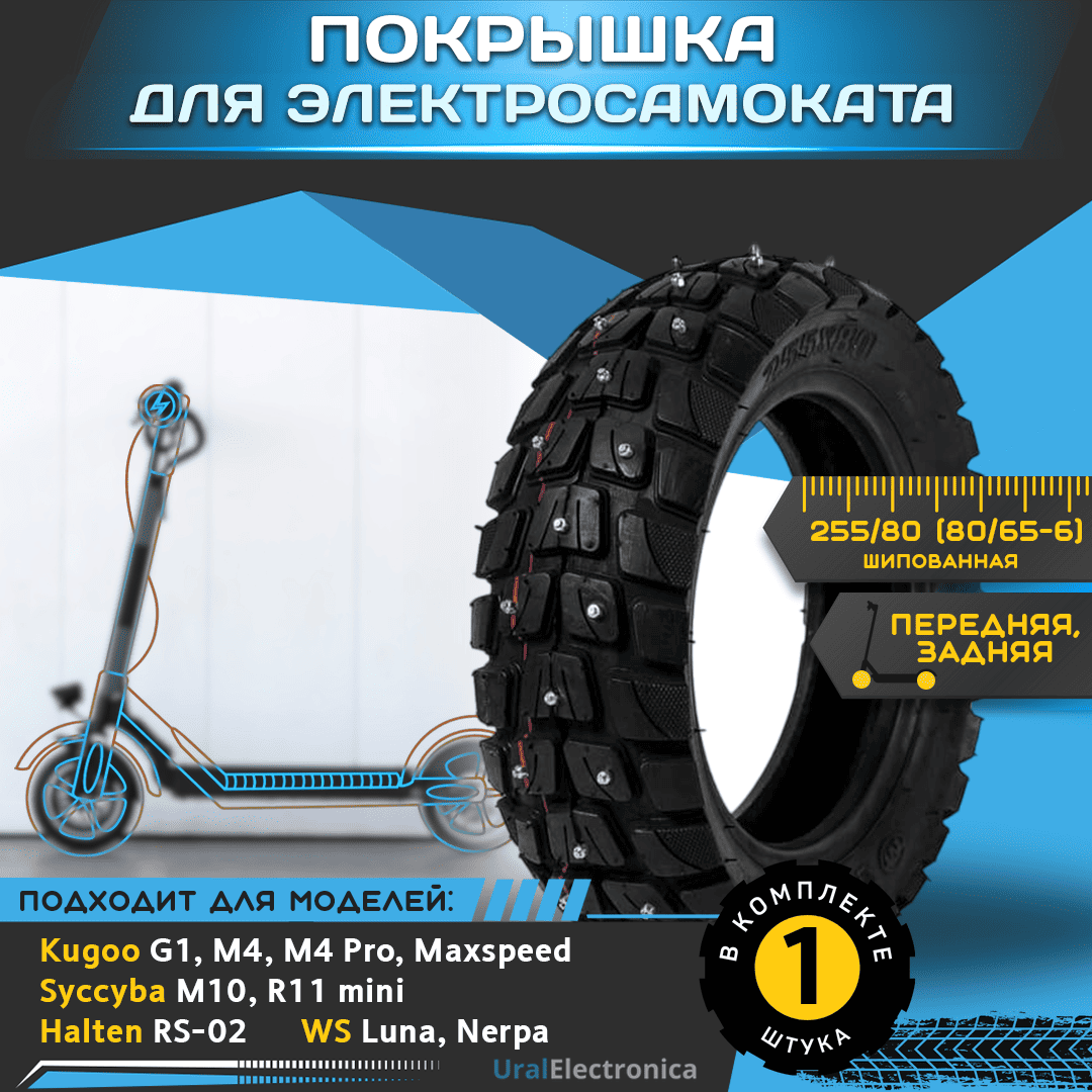 Покрышка 2255/80 (80/65-6) шипованная, предназначена для электросамоката Kugoo G1, M4, M4 Pro, Maxspeed/ Halten Cross, RS-02 / WS Luna, Nerpa/ Syccyba (Currus) M10, R11 mini / Ultron T103, X2, T10/ Yokamura RX1, RX2/ GT M4/M4 Pro; а также любого другого электросамоката с аналогичным размером. Резина износостойкая и отличается долгим сроком службы. Данная покрышка обеспечит уверенное сцепление с поверхностью. Возможность установки на переднее и заднее колесо.