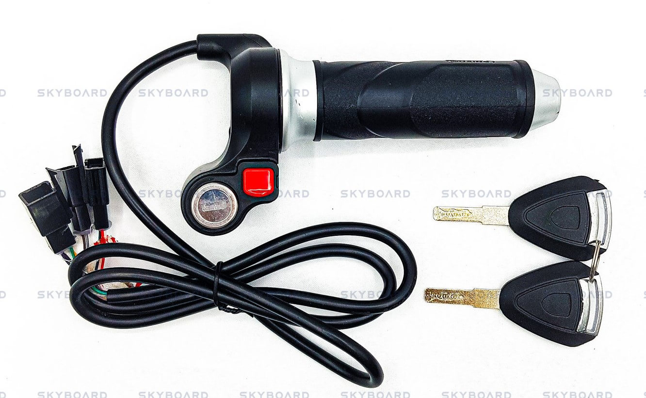 В комплекте: грипса (рукоятка), замок зажигания с ключем, кнопка переключения скорости, акселератор (газуля), шнур (кабель)