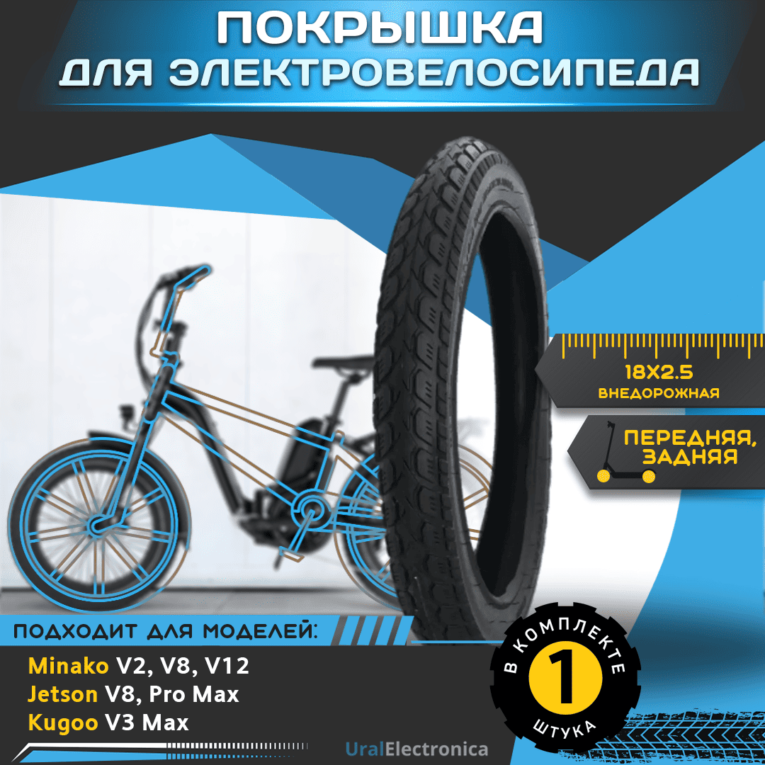 Покрышка внедорожная 18х2.5, предназначена для электровелосипеда Minako V2, V8, V8 pro, V12, V12 LUX, V8 Eco / Jetson V8, Pro Max, Pro Max Ultra Plus, Pro Max Ultra, Pro Max Classic / Kugoo V3 Max, а также любого другого электровелосипеда с аналогичным размером. Резина износостойкая и отличается долгим сроком службы. Данная покрышка обеспечит уверенное сцепление с поверхностью. Возможность установки на переднее и заднее колесо.